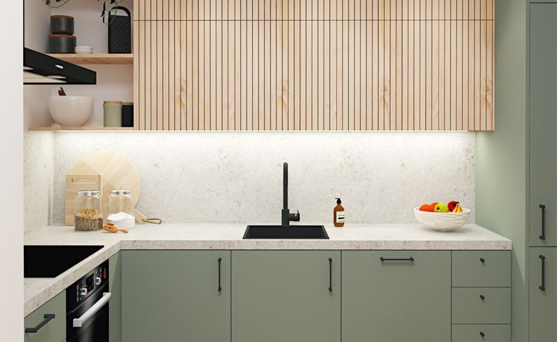 زمانی که میخواهید آشپزخانهای روشن و خنثی داشته باشید، اما رنگ و عمق بصری بیشتری نسبت به آشپزخانههای تمام سفید میخواهید، رنگ سبز انتخابی مناسب است همچنین با رنگ های دیگر نیز به خوبی جفت می شود.