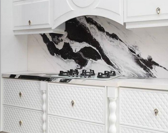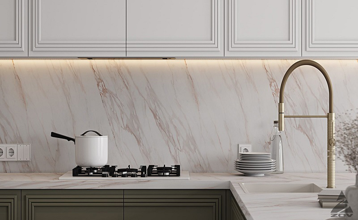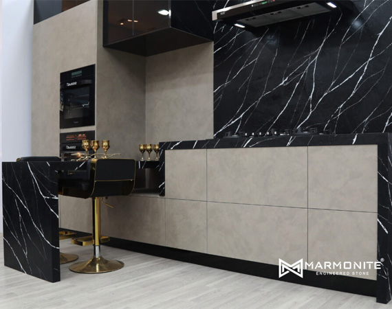 - بین کابینتی سنگ مارمونایت: برخی تمایل دارند که متریال بین کابینتی را مانند متریال صفحه روی کابینت از جنس مارمونایت استفاده کنند. در صورتی که با هزینه بالای آن مشکلی نداشته باشید می توانید این کار را انجام دهید. اما باید در نظر داشته باشید امروزه از نظر زیبایی شناسی استفاده از متریال یکسان برای بین کابینتی و صفحه کنار گذاشته شده است.